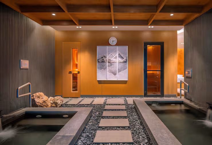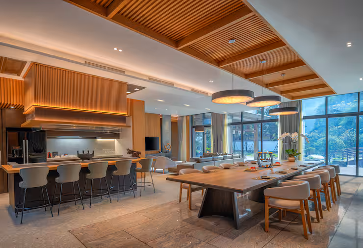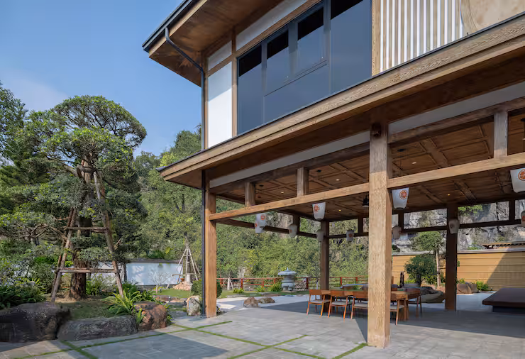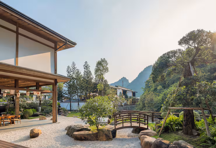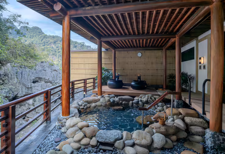 1250 mét vuông, vườn thiền, 3 bể bơi onsen đá, phòng xông hơi khô, WiFi, quầy teppanyaki, nhà bếp, phòng giải trí