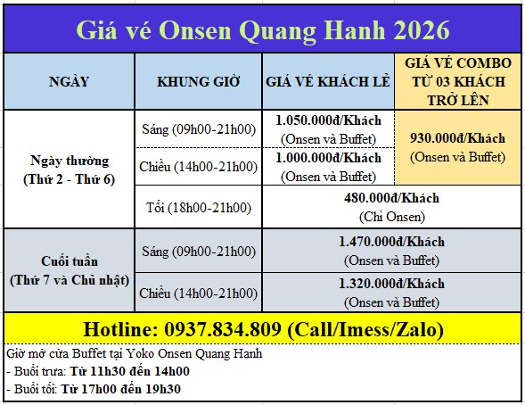 Giá vé Onsen Quang Hanh Khung giờ từ 14h00